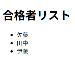 このJavaScriptコードが実行されると、HTMLの<ul></ul>タグの中に以下の内容が動的に挿入され、ブラウザに表示されます。
