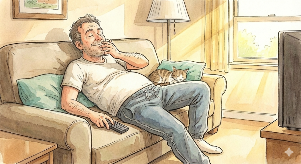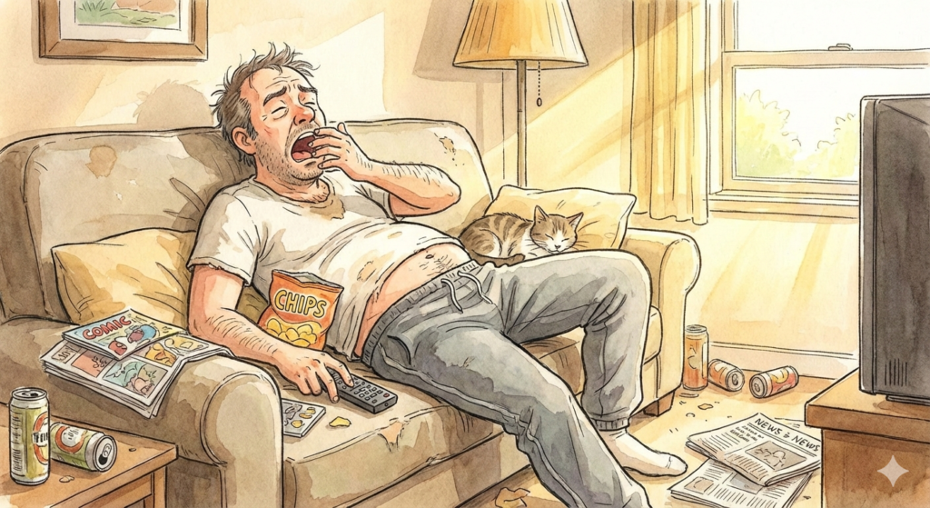 今回は、Nano Banana を使って、部屋でゴロゴロしている暇そうなおっさんのイラストを作ってみました。